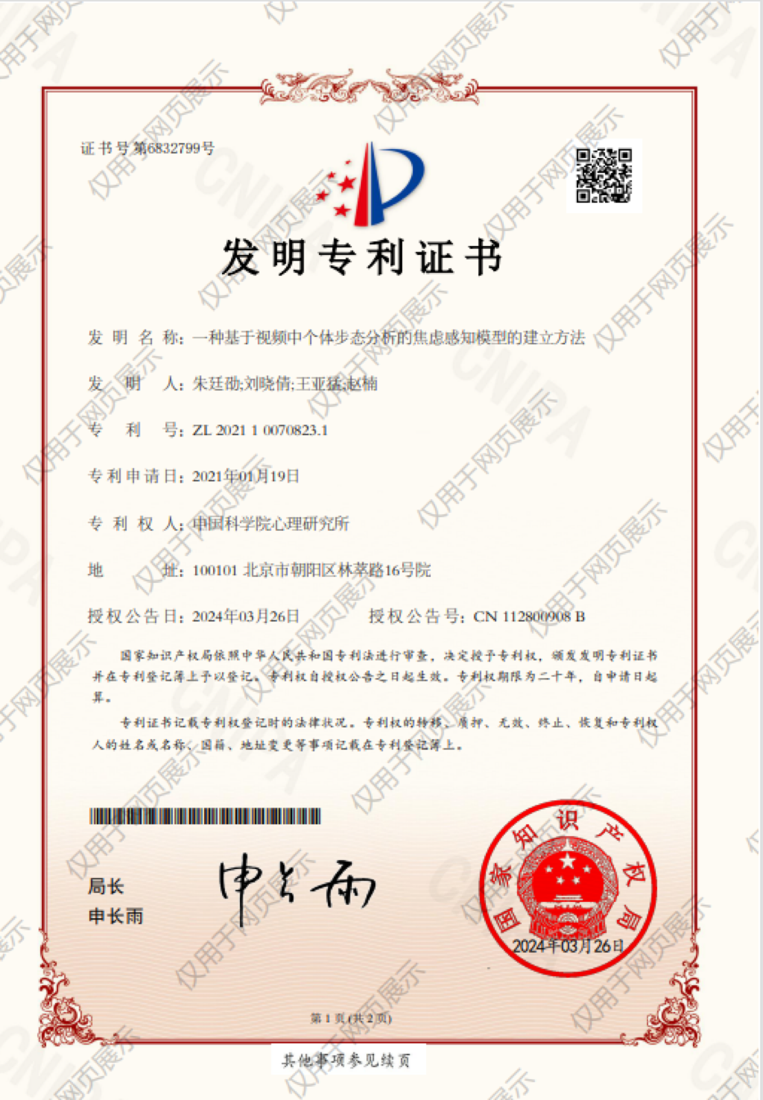 - 朱廷劭,刘晓倩,王亚猛,赵楠,一种基于视频中个体步态分析的焦虑感知模型的建立方法:中国,ZL 202110070823.1