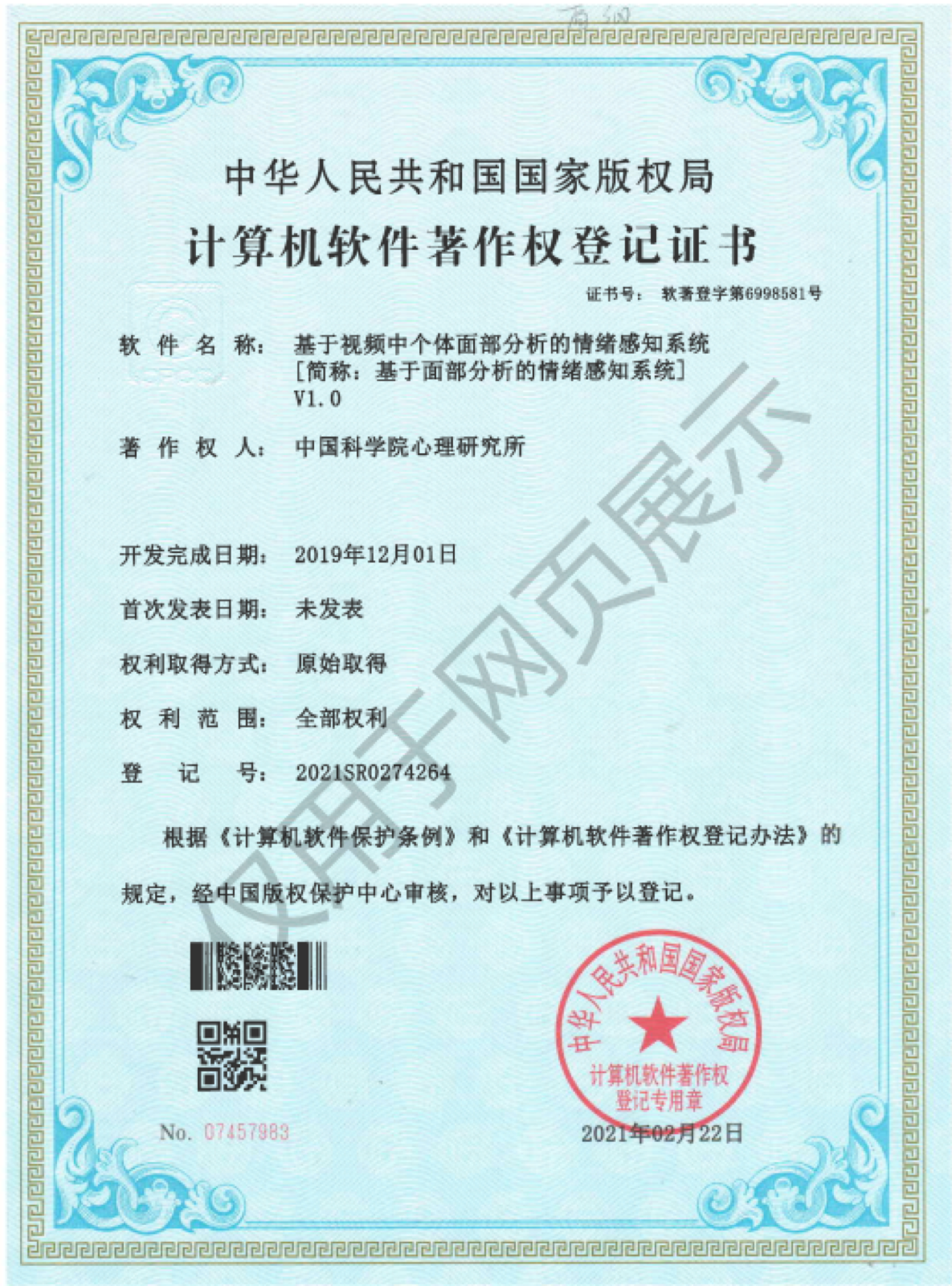 - 基于视频中个体面部分析的情绪感知系统V1.0:软著登记号:2021SR0274264,登记日期:2021年2月22日