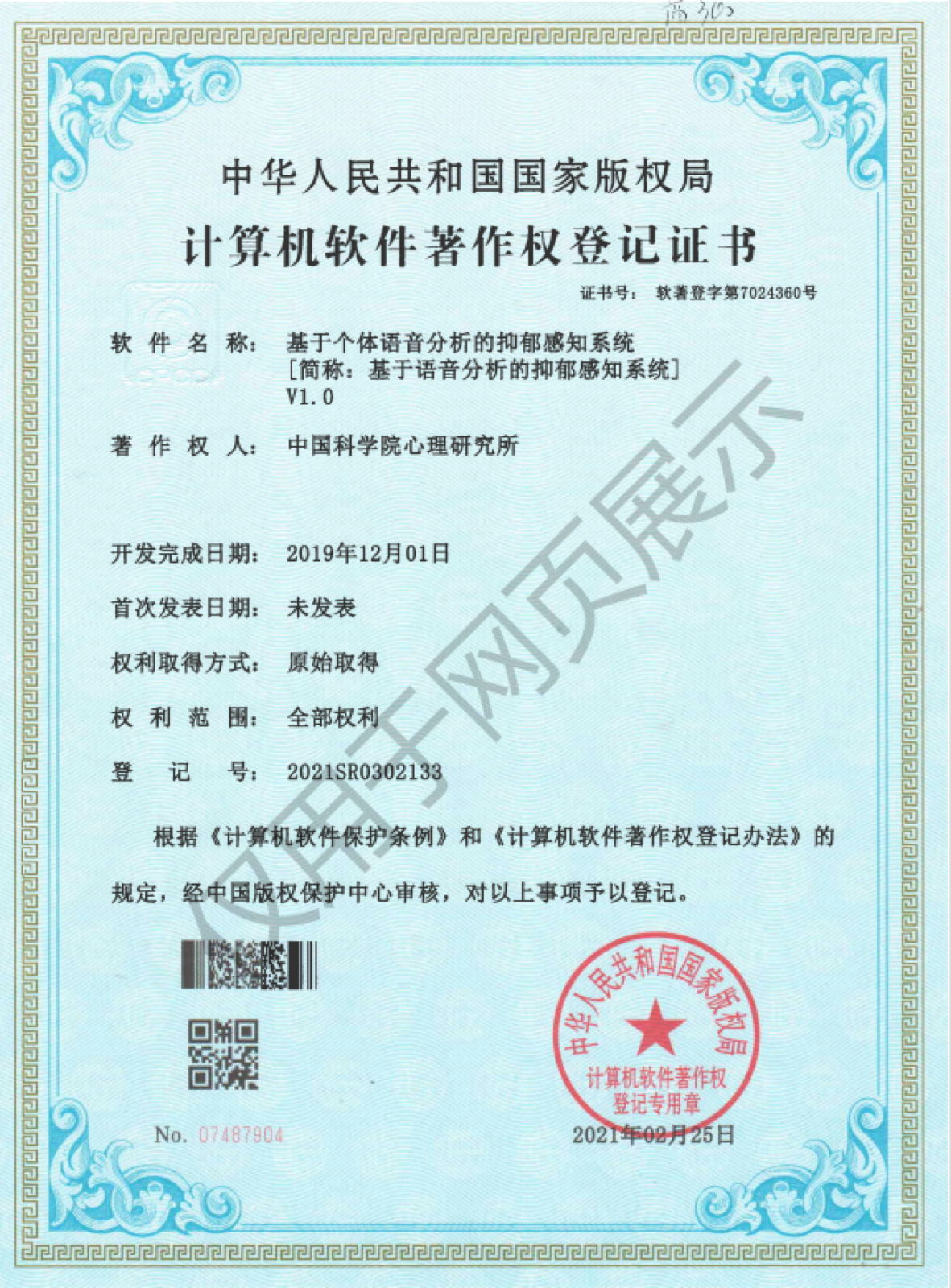 - 5)基于个体语音分析的抑郁感知系统V1.0:软著登记号: 2021SR0302133,登记日期:2021年2月25日
