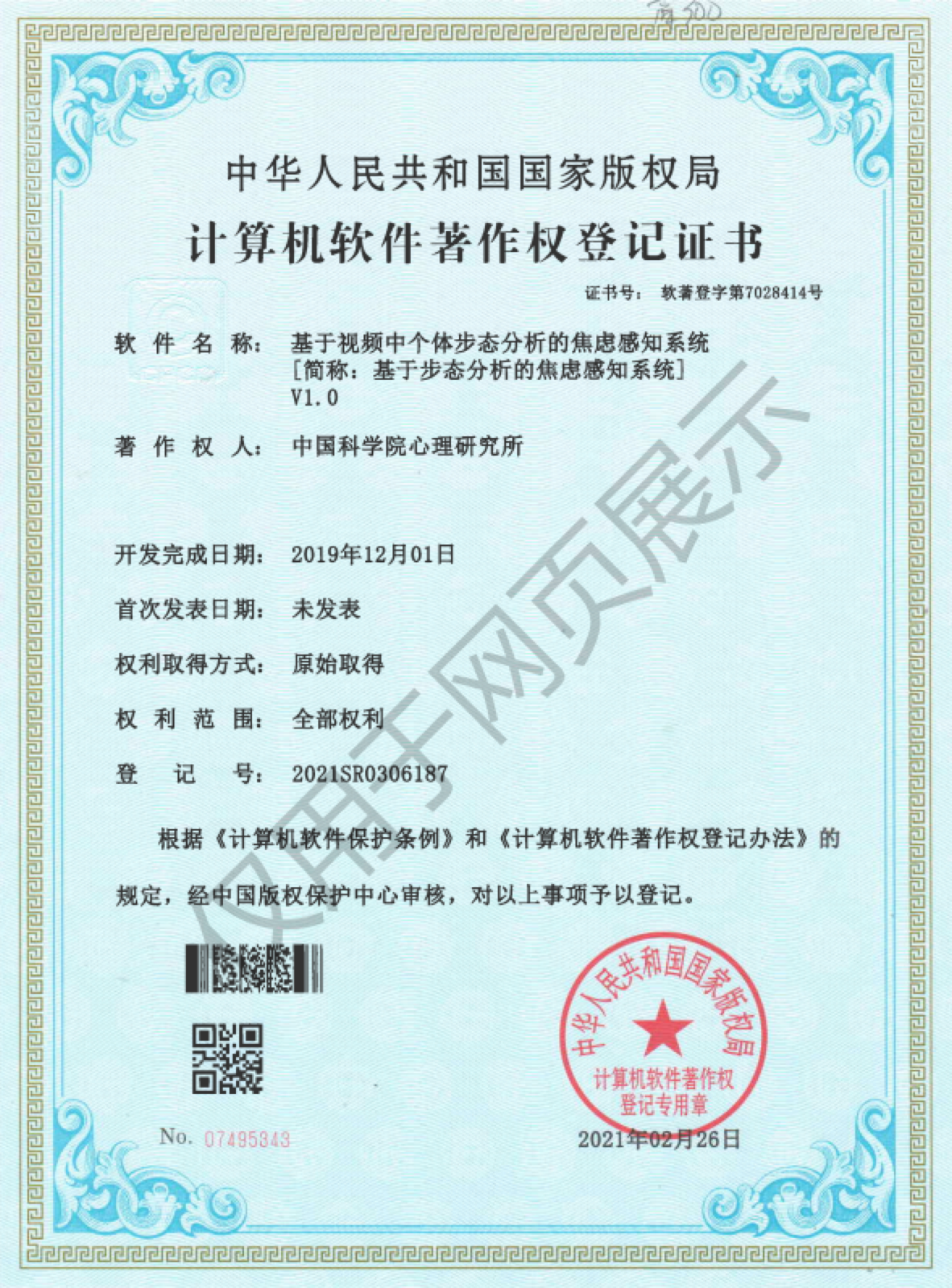 - 6)基于视频中个体步态分析的焦虑感知系统V1.0:软著登记号:2021SR0306187,登记日期:2021年2月26日