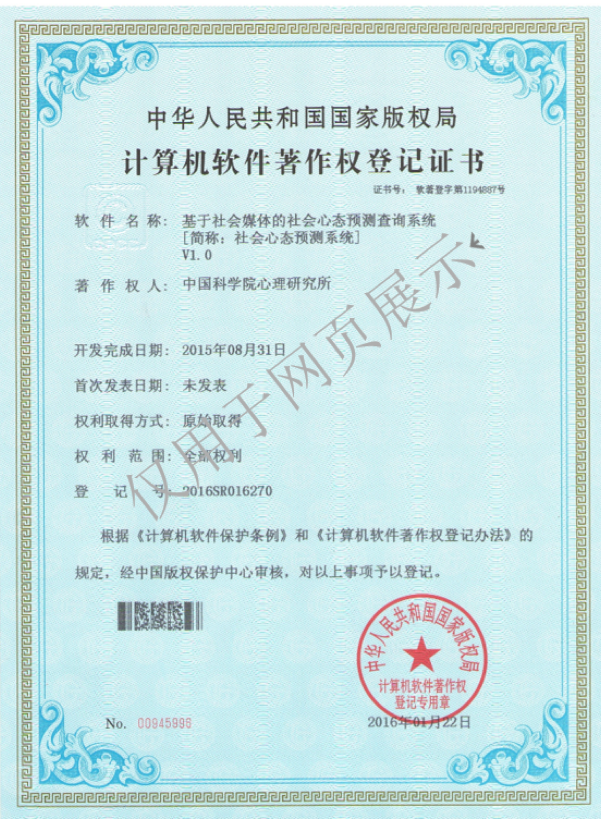 - 7)基于社会媒体的社会心态预测查询系统V1.0:软著登记号:2016SR016270,登记日期:2016年1月22日