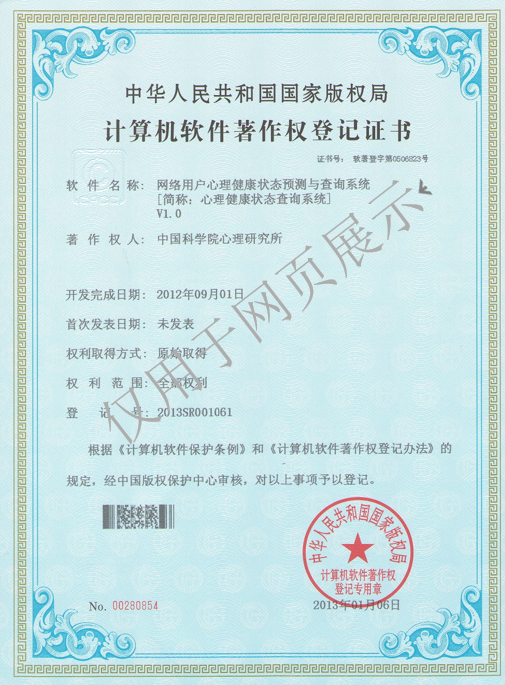 - 8)网络用户心理健康状态预测与查询系统:软著登记号:2013SR001061,登记日期:2013年1月6日